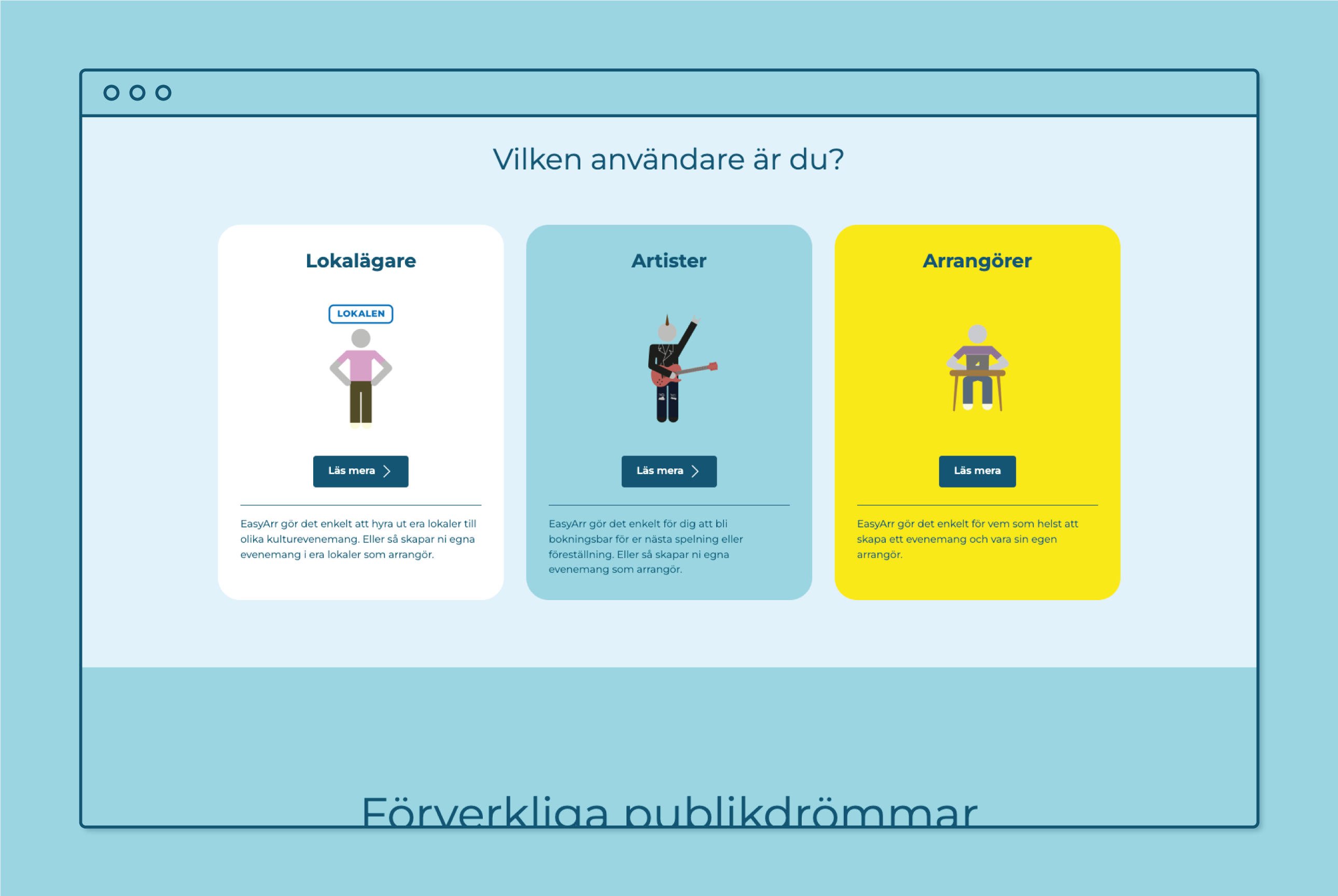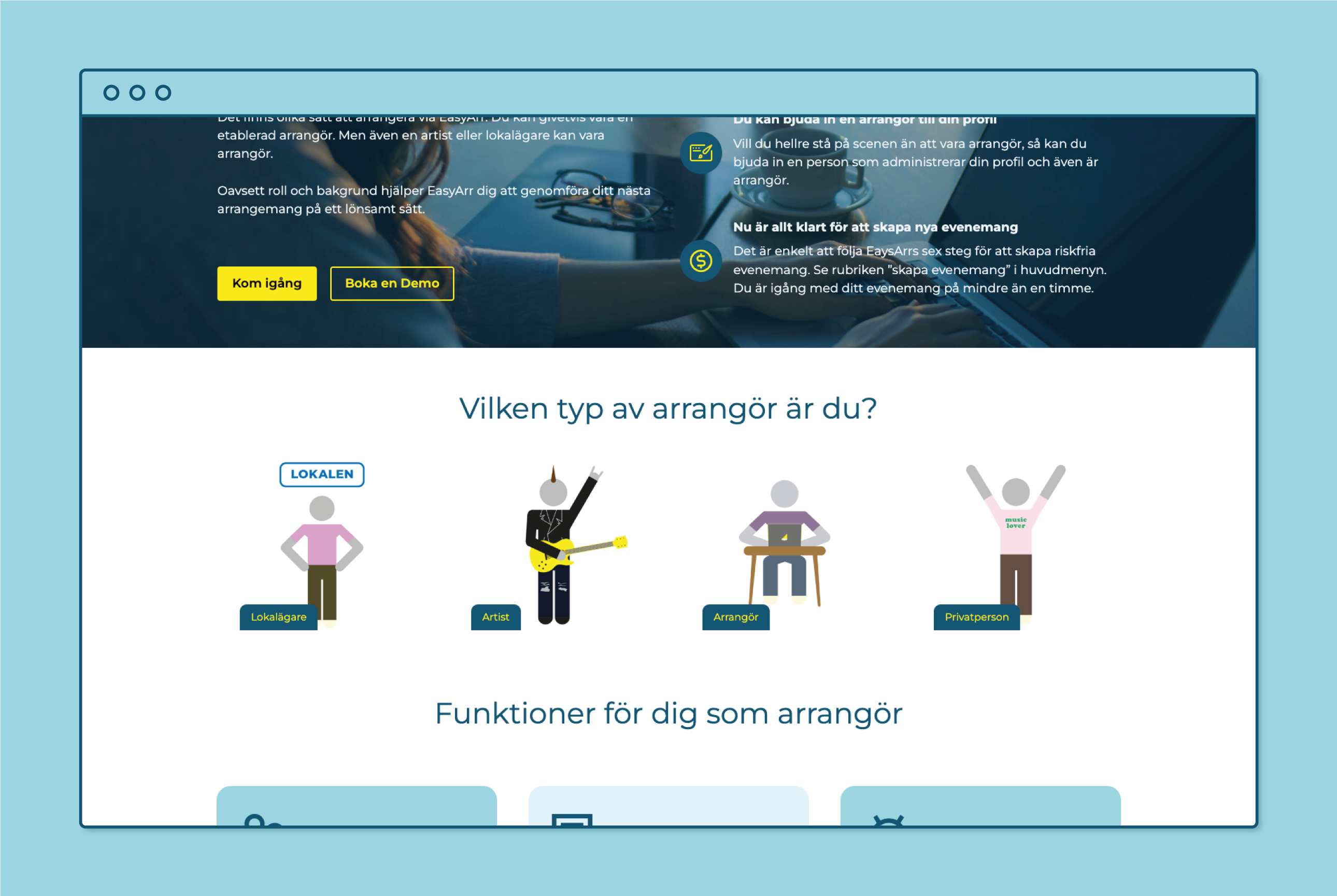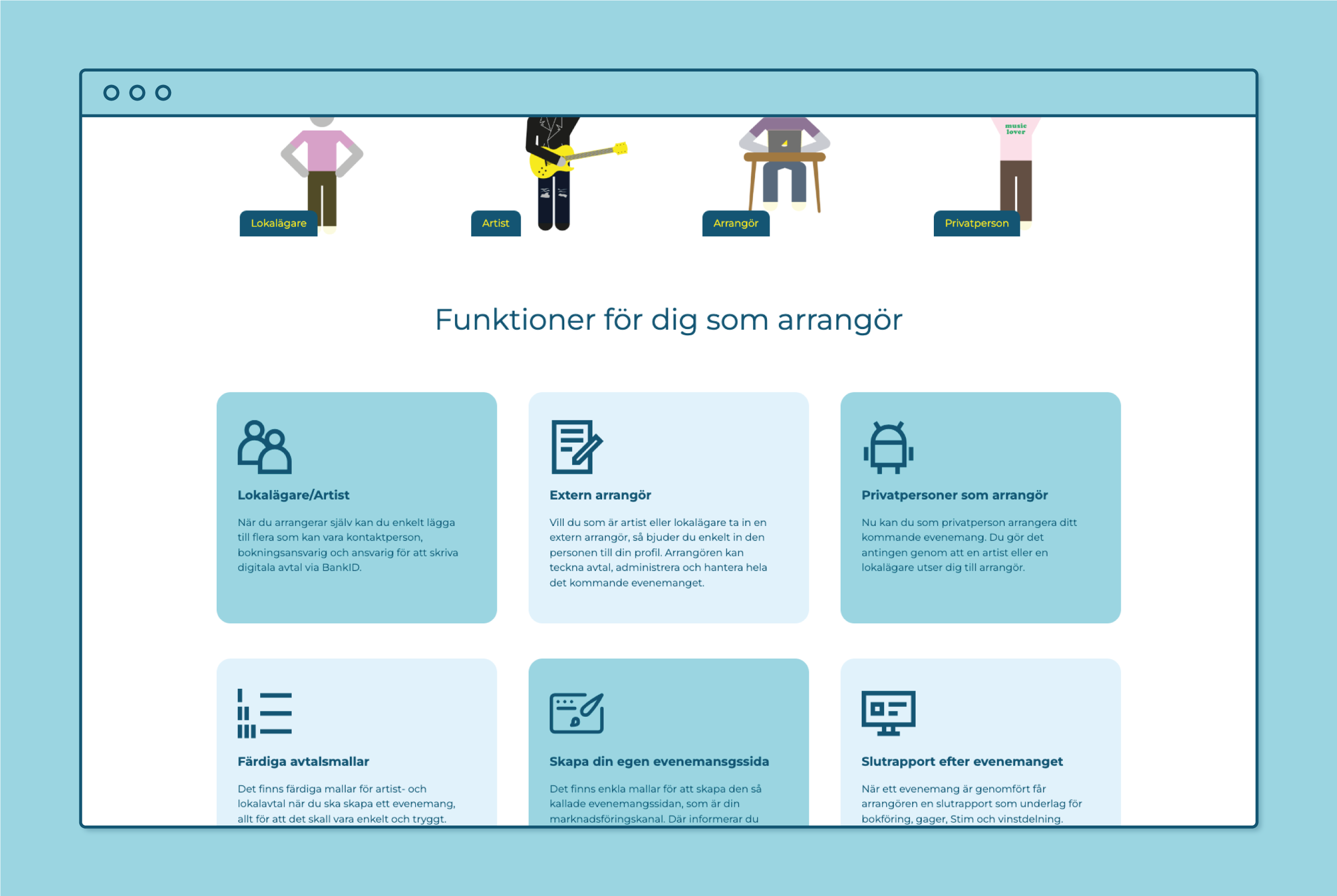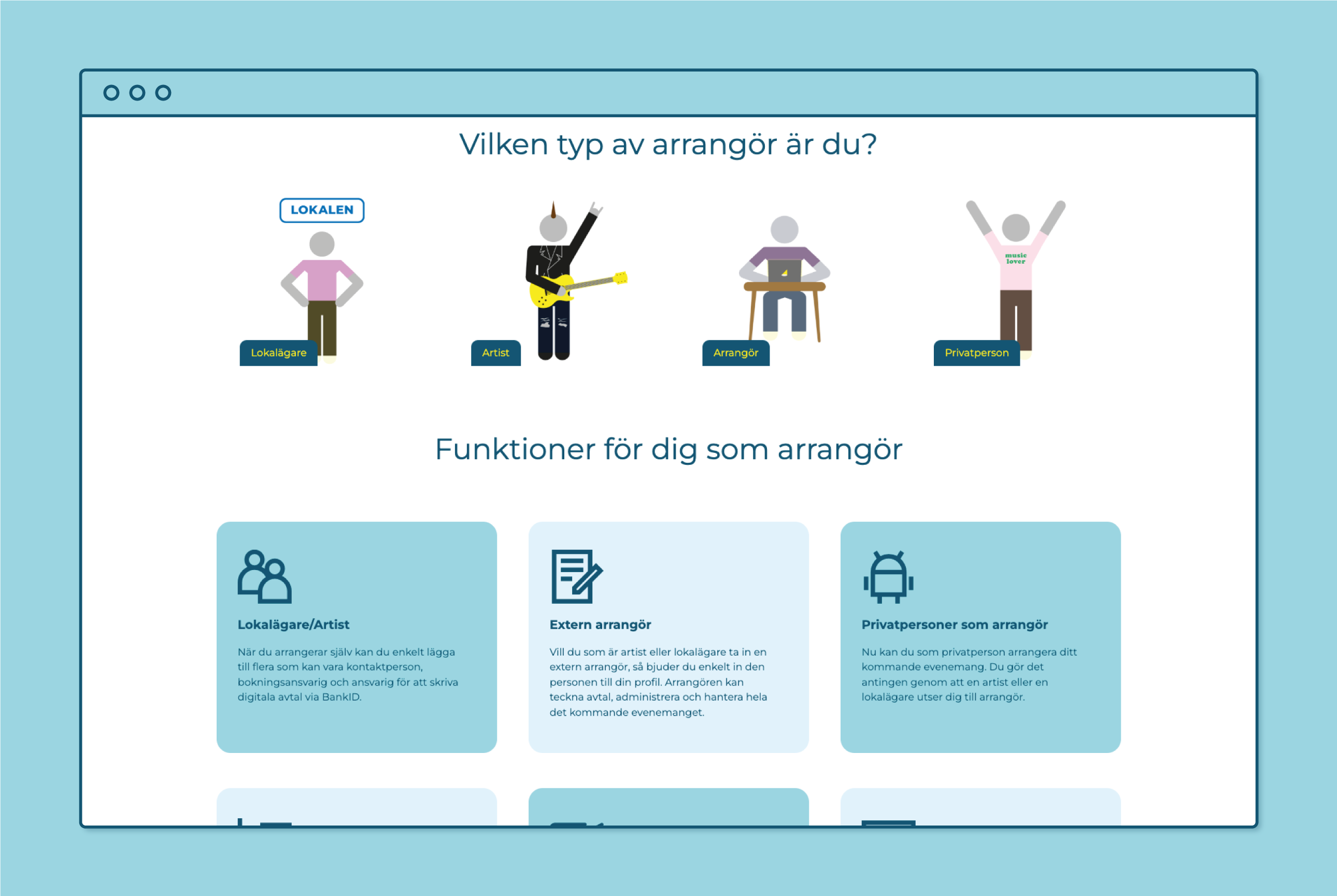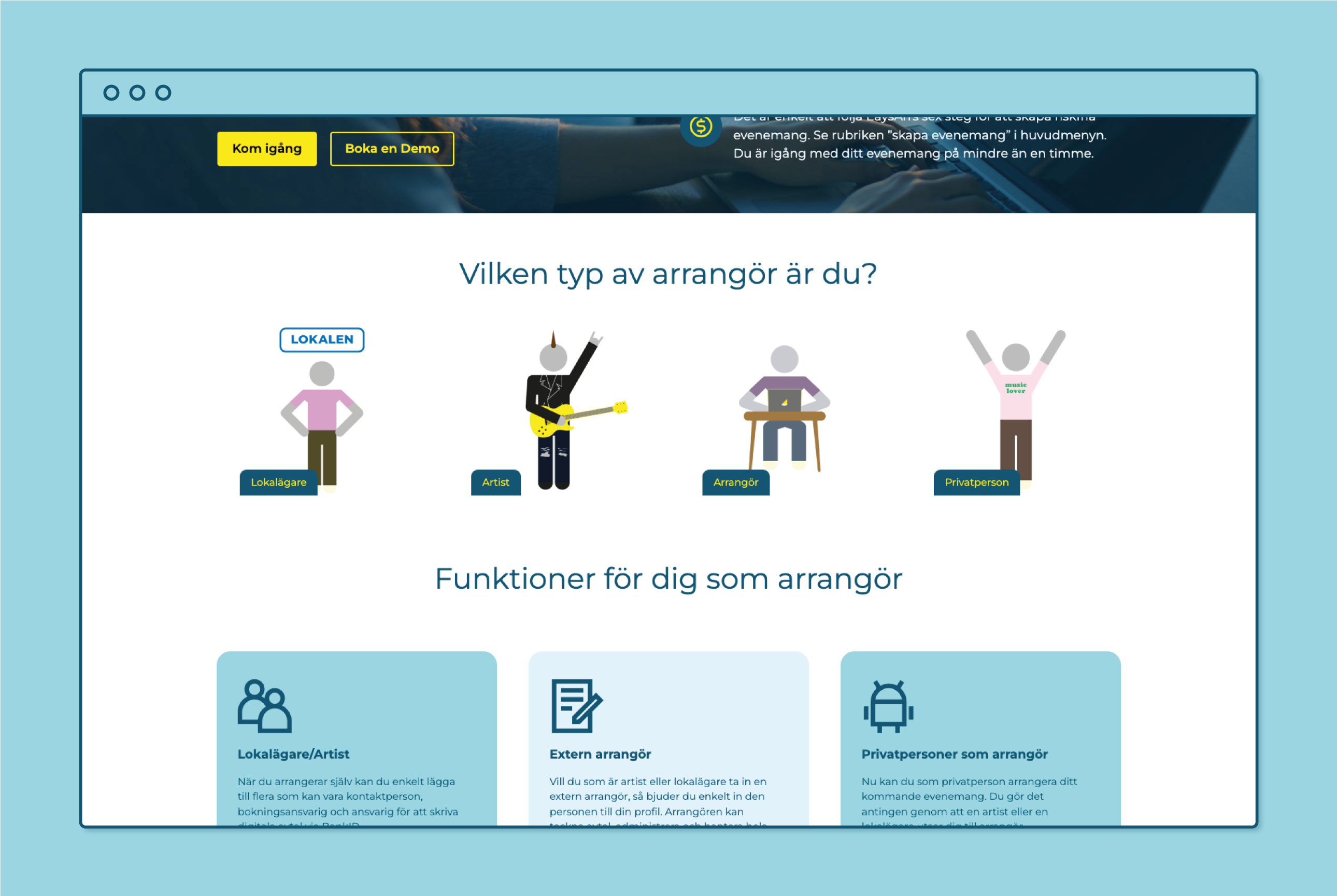 The visual identity had already been created when I got on the project. Meaning the logo, fonts: Montserrat and primary colors blue white, so I set out to add som more soft secondary colours to balance out the strong blue and yellow. I then created graphic illustrations representing the wast range of different artists, promoters, venue owners and fans. That are used to visually clarify the product to the user.